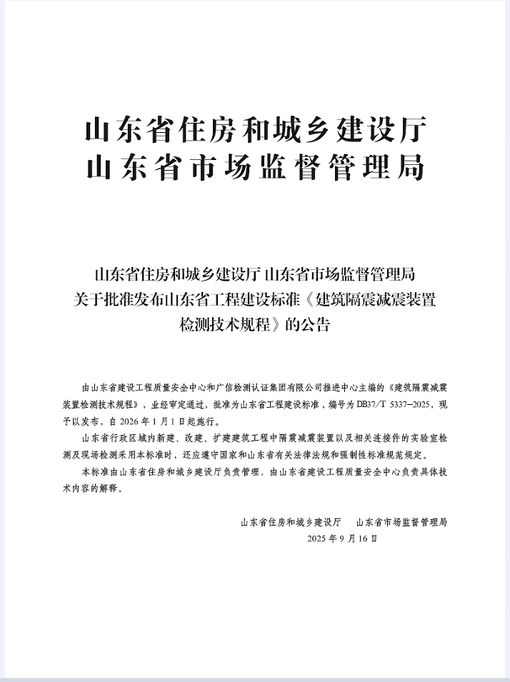 关于批准发布山东省工程建设标准《建筑隔震减震装置检测技术规程》的公告
