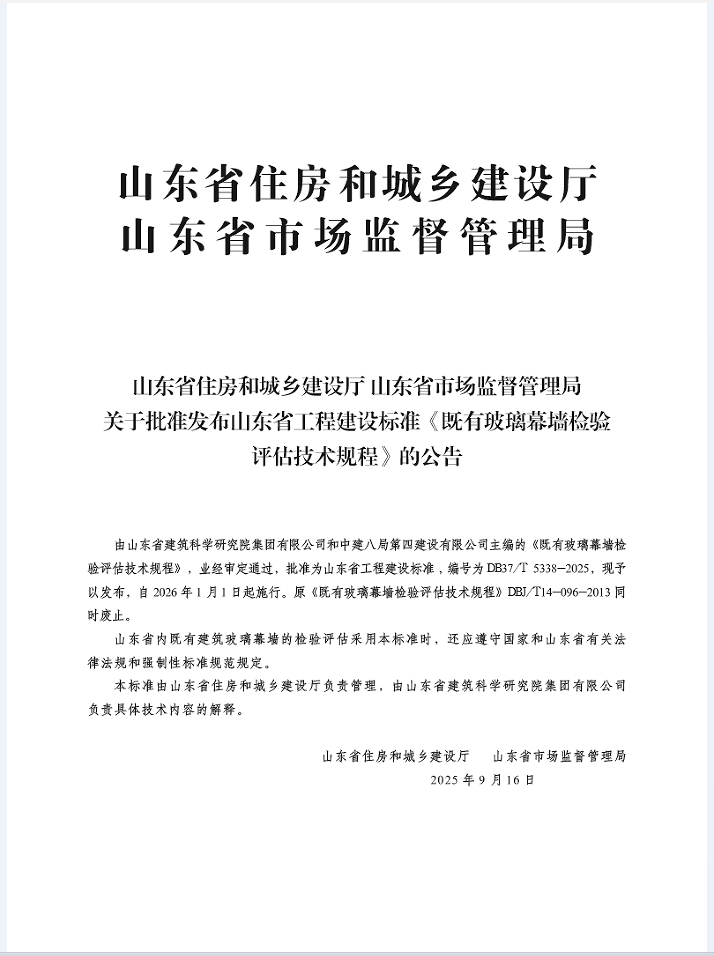 关于批准发布山东省工程建设标准《既有玻璃幕墙检验评估技术的规程》的公告