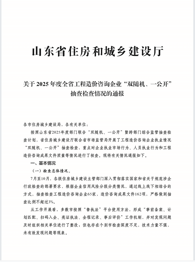 关于2025年度全省工程造价咨询企业“双随机、一公开”抽查检查情况的通报