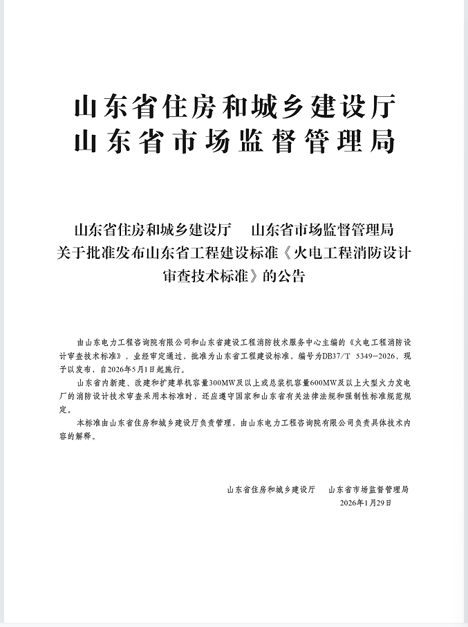 关于批准发布山东省工程建设标准《火电工程消防设计审查技术标准》的公告