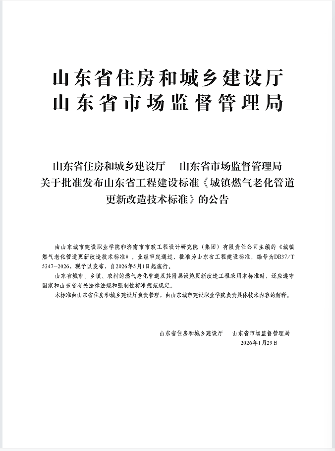 关于批准发布山东省工程建设标准《城镇燃气老化管道更新改造技术标准》的公告